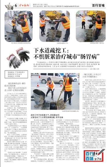 11時30分,體驗結束,記者只挖了兩口窨井,渾身就像散了架一樣。姚俊民說:“下水道疏挖工每天很辛苦,但愿市民都能提高素質,不再往下水道里扔垃圾,這樣就能減輕他們的工作量了?!?br />