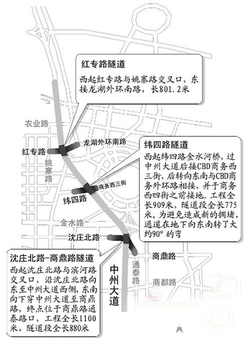 2014年11月30日,鄭州緯四路下穿中州大道工程已實(shí)行單幅西向東試通車,而紅專路下穿中州大道也于次日雙向機(jī)動(dòng)車道放行。預(yù)計(jì)春節(jié)前,兩個(gè)下穿通道人行道和非機(jī)動(dòng)車道也將通行,鄭州金水路、中州大道和未來(lái)路等周邊道路的交通壓力將得到極大緩解。