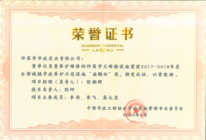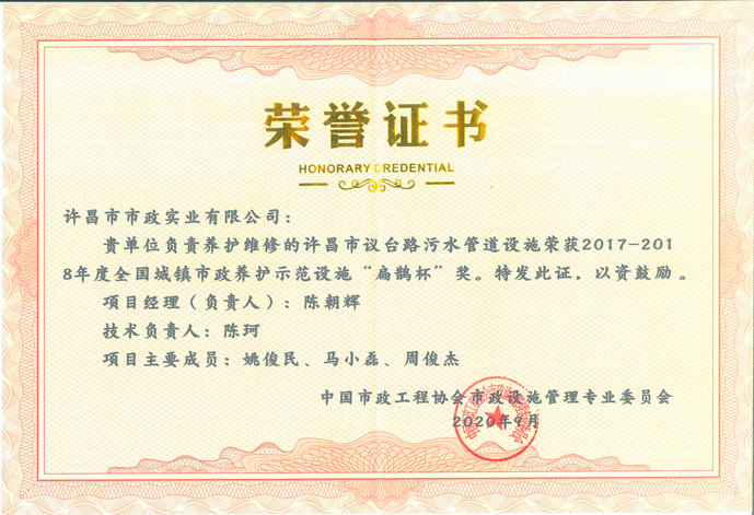 此外,許昌市政集團還被評為2017-2018年度“全國市政設(shè)施養(yǎng)護管理行業(yè)誠信單位”。